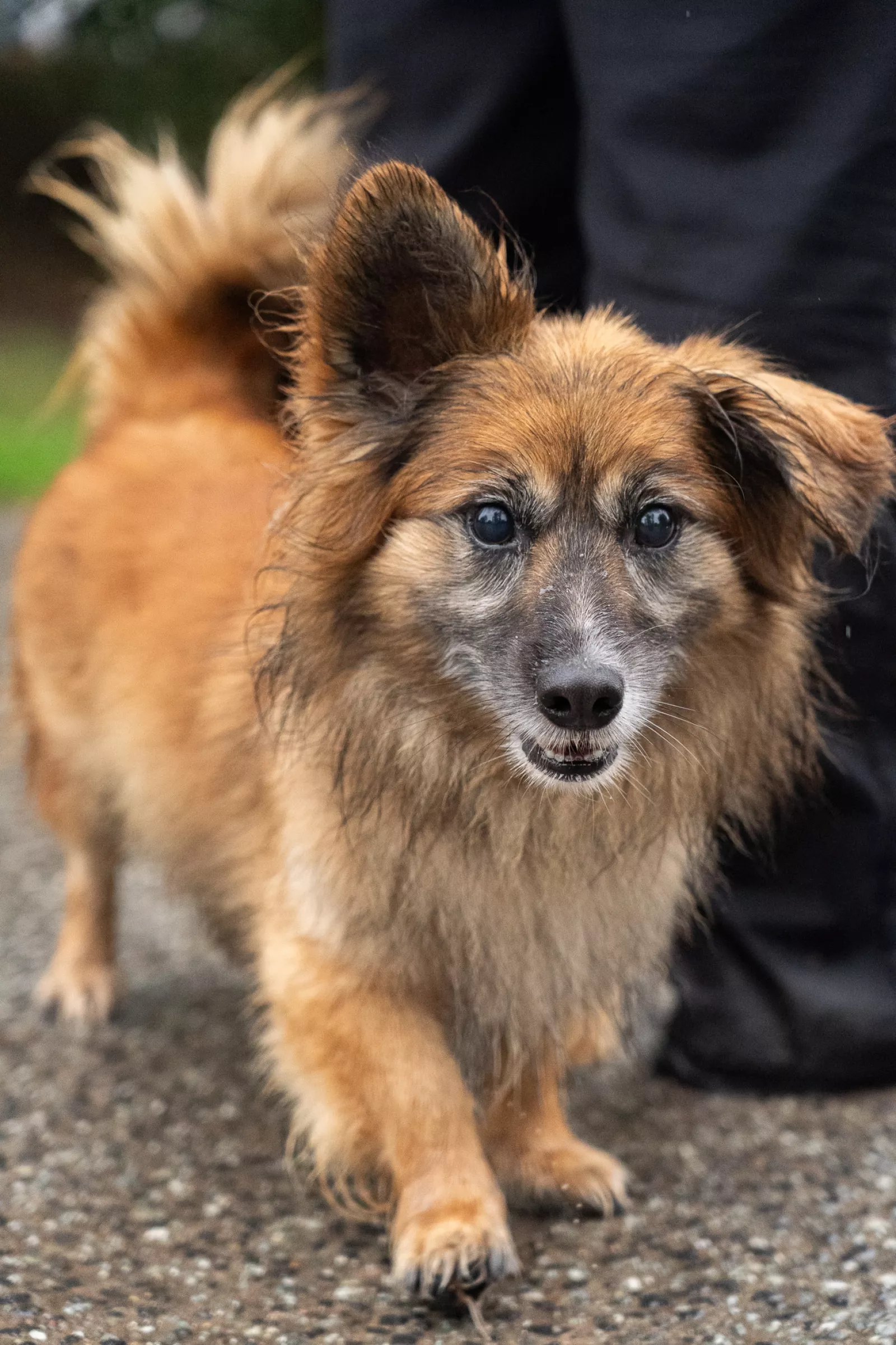 Trochę boi się ruchu ulicznego, ale przy wsparciu człowieka pokonuje obawy.