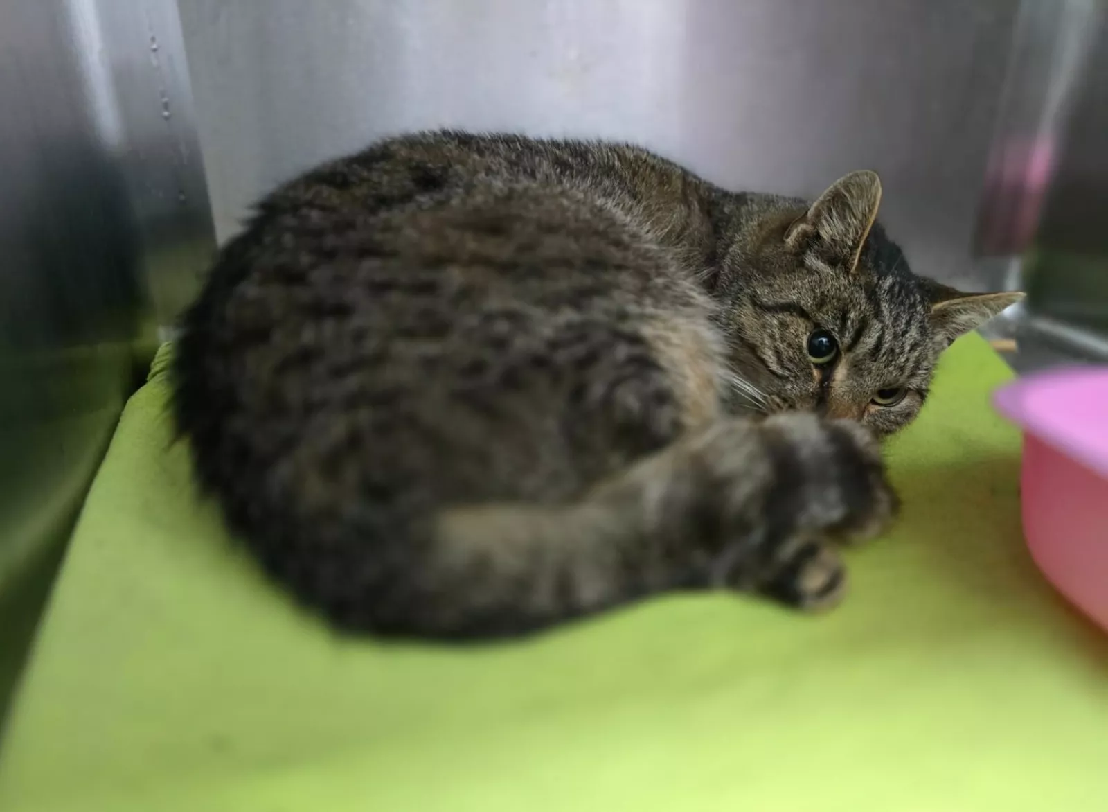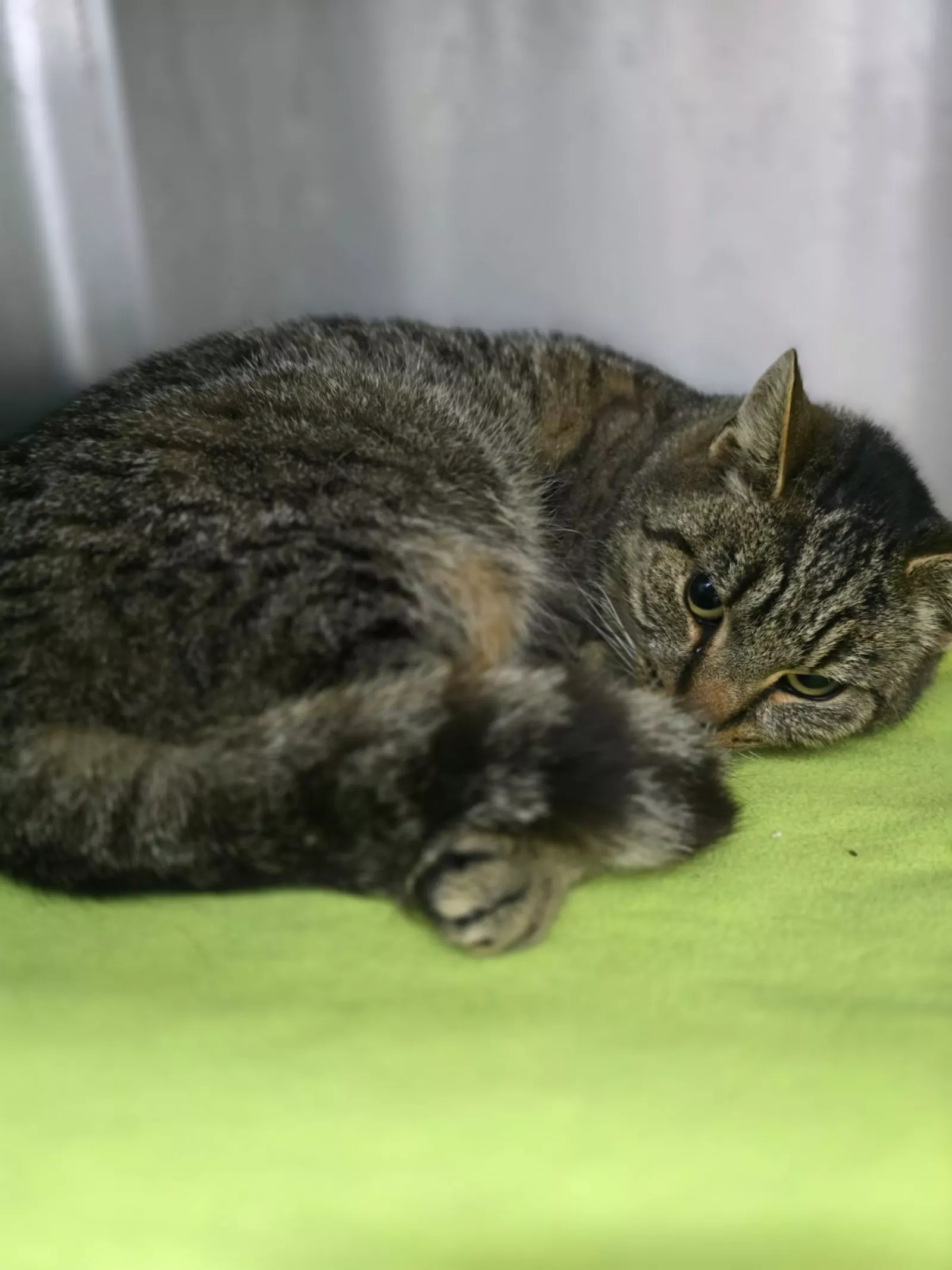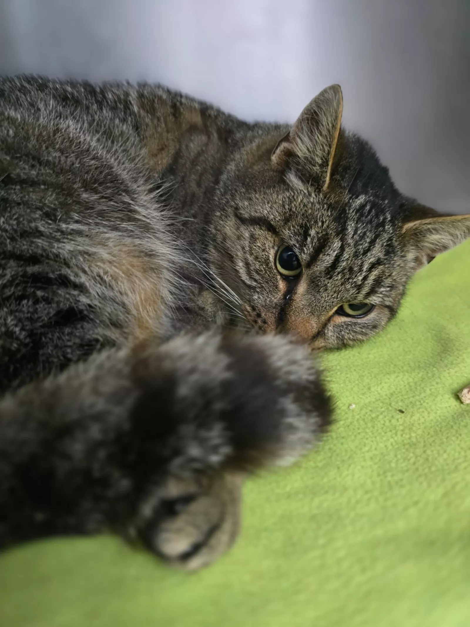 Spokojna i bardzo dzielna kocia. Mimo trudnych doświadczeń losu nie traci zaufania do człowieka.