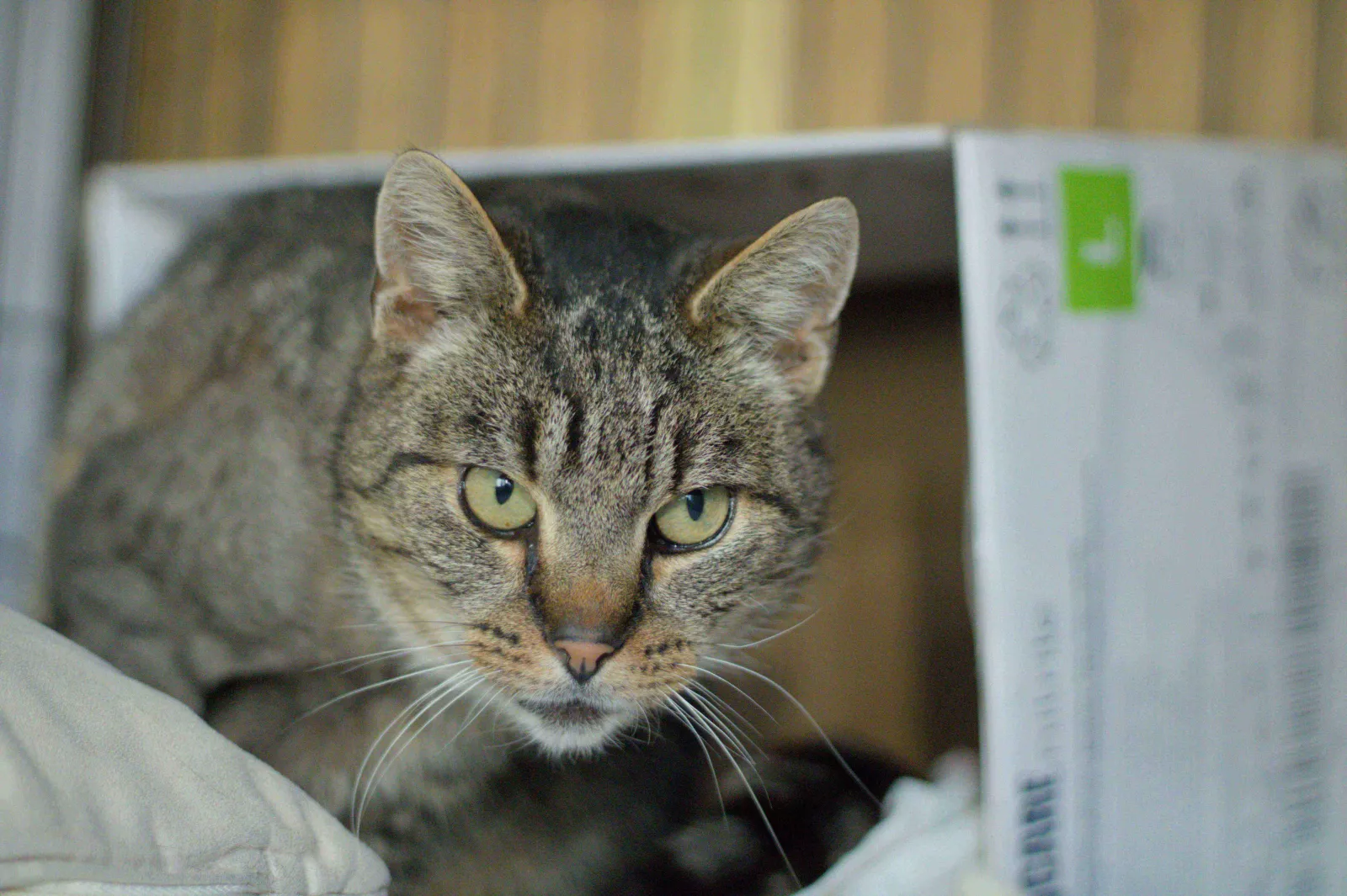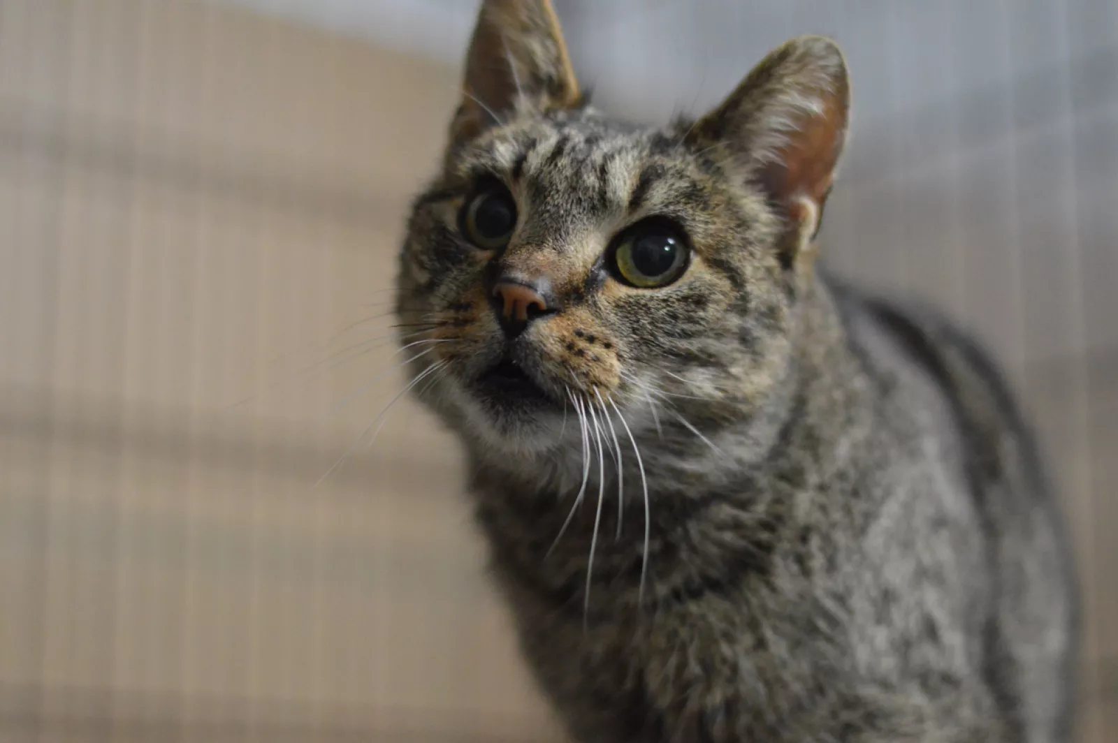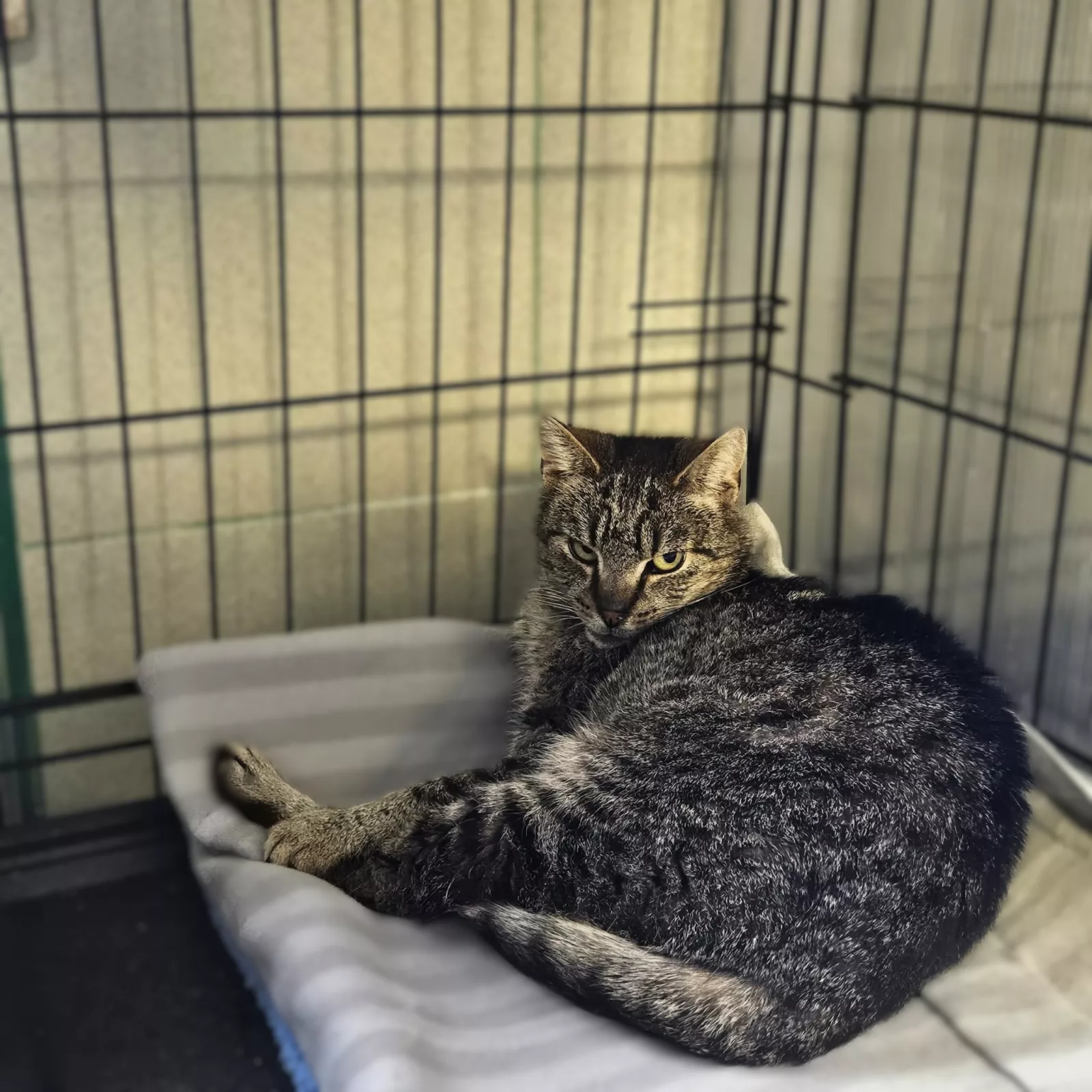 Spokojna i bardzo dzielna kocia. Mimo trudnych doświadczeń losu nie traci zaufania do człowieka.