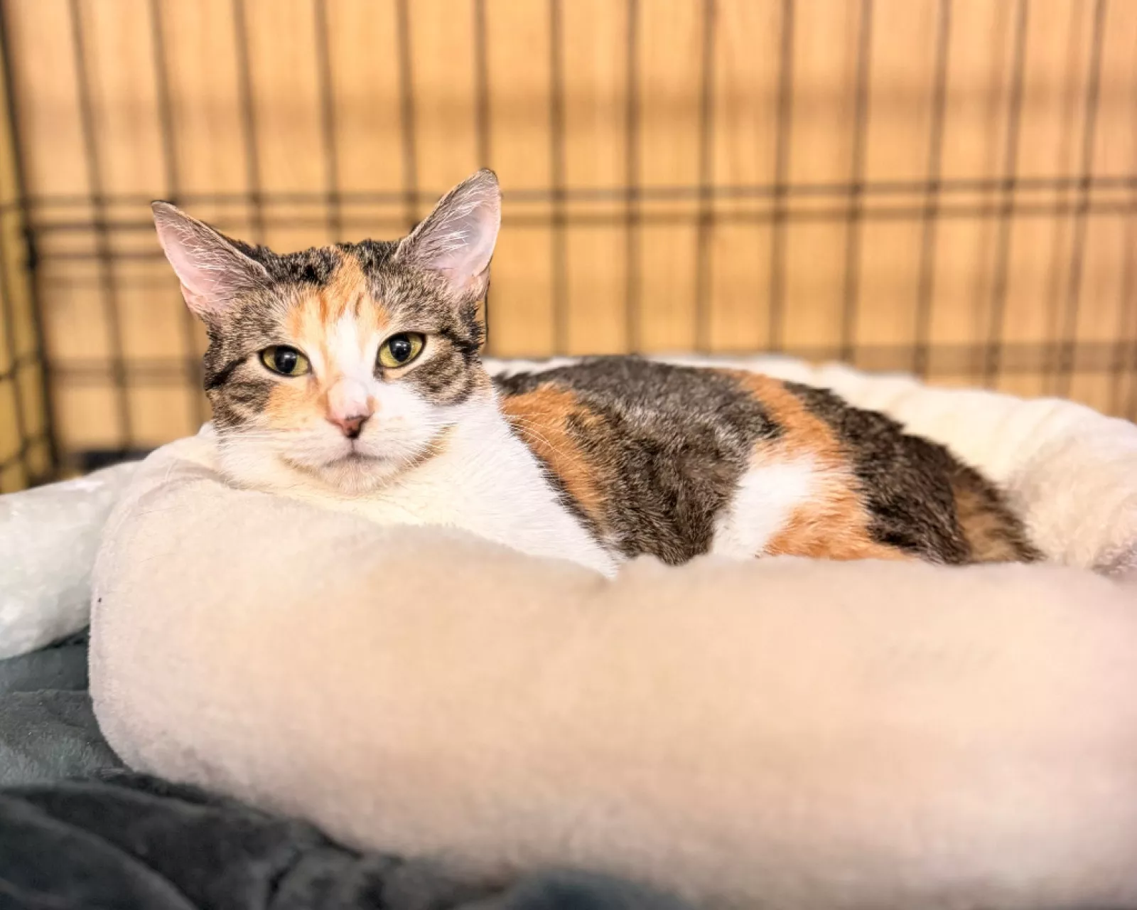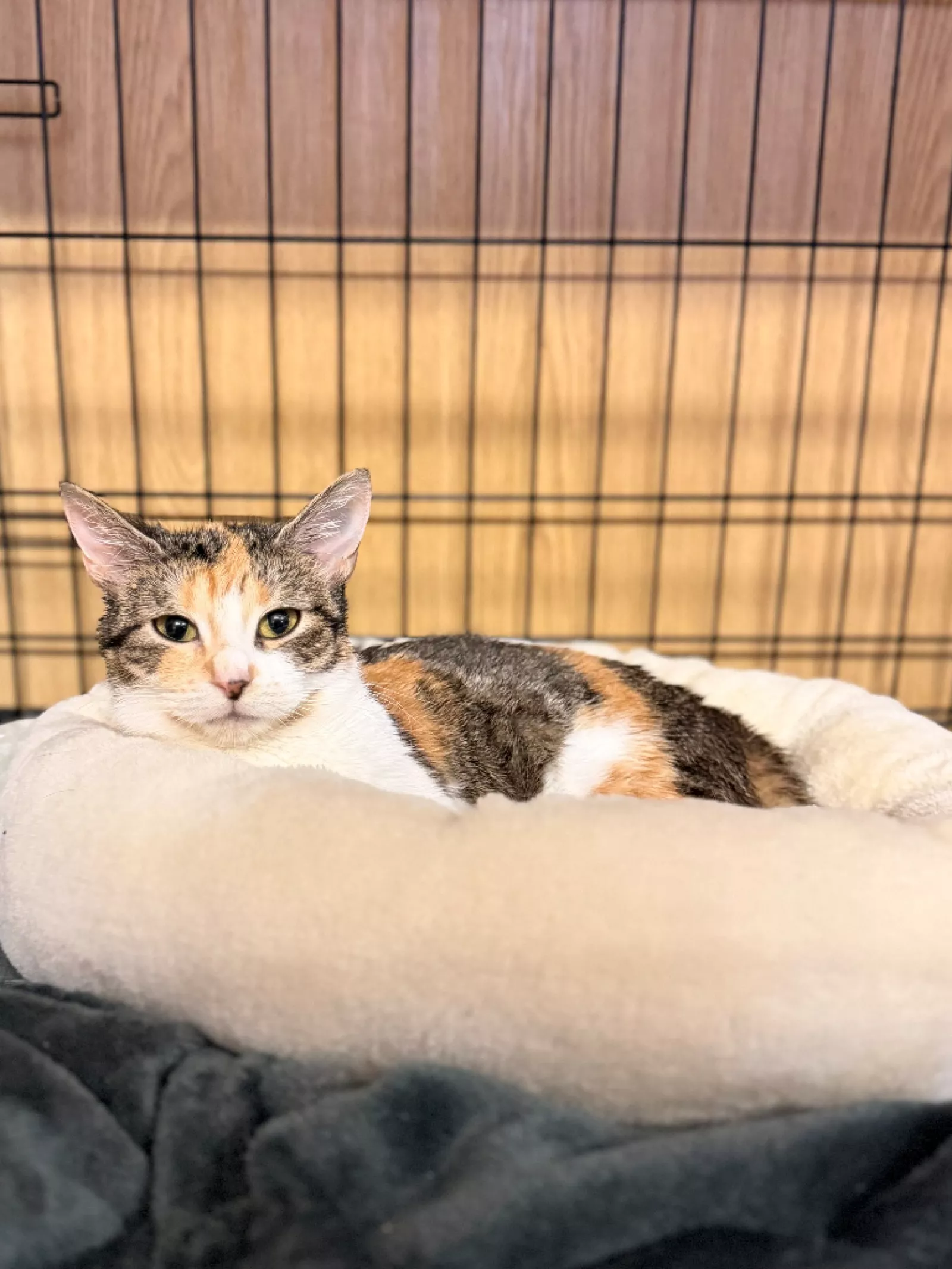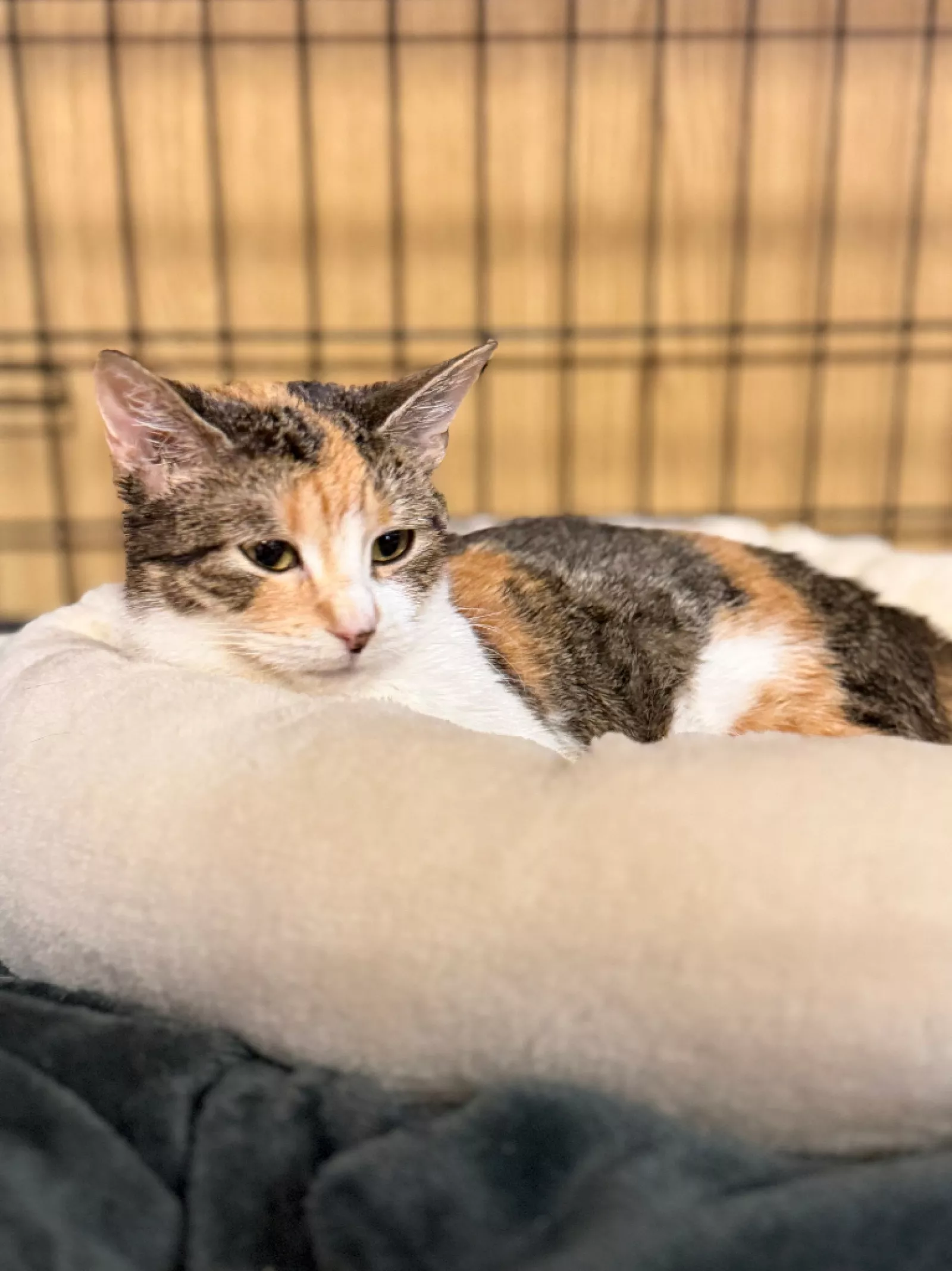 Alisa to około 3-letnia koteczka o pięknym, trikolorowym umaszczeniu. Trafiła do schroniska i wciąż oswaja się z nową sytuacją. Widać, że miejsce, w którym się znalazła, jest dla niej zaskoczeniem.