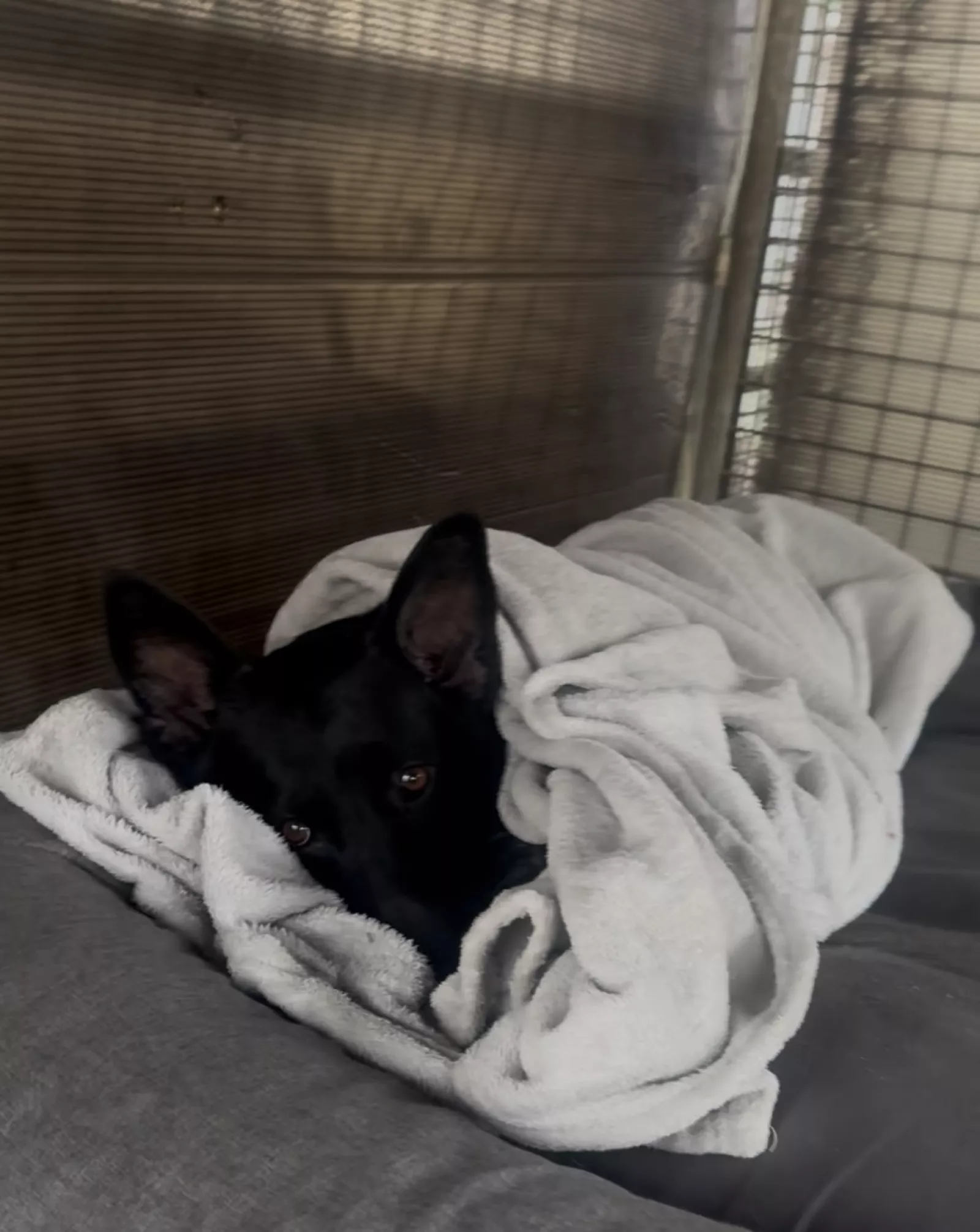 Leży cicho, wpatrzona w jeden punkt. Bez skarg, bez hałasu. Tylko ten wzrok — pełen smutku, który łamie serce. To spojrzenie psa, który tak bardzo potrzebuje domu, bliskości i ramion, w których będzie mógł poczuć się bezpiecznie.